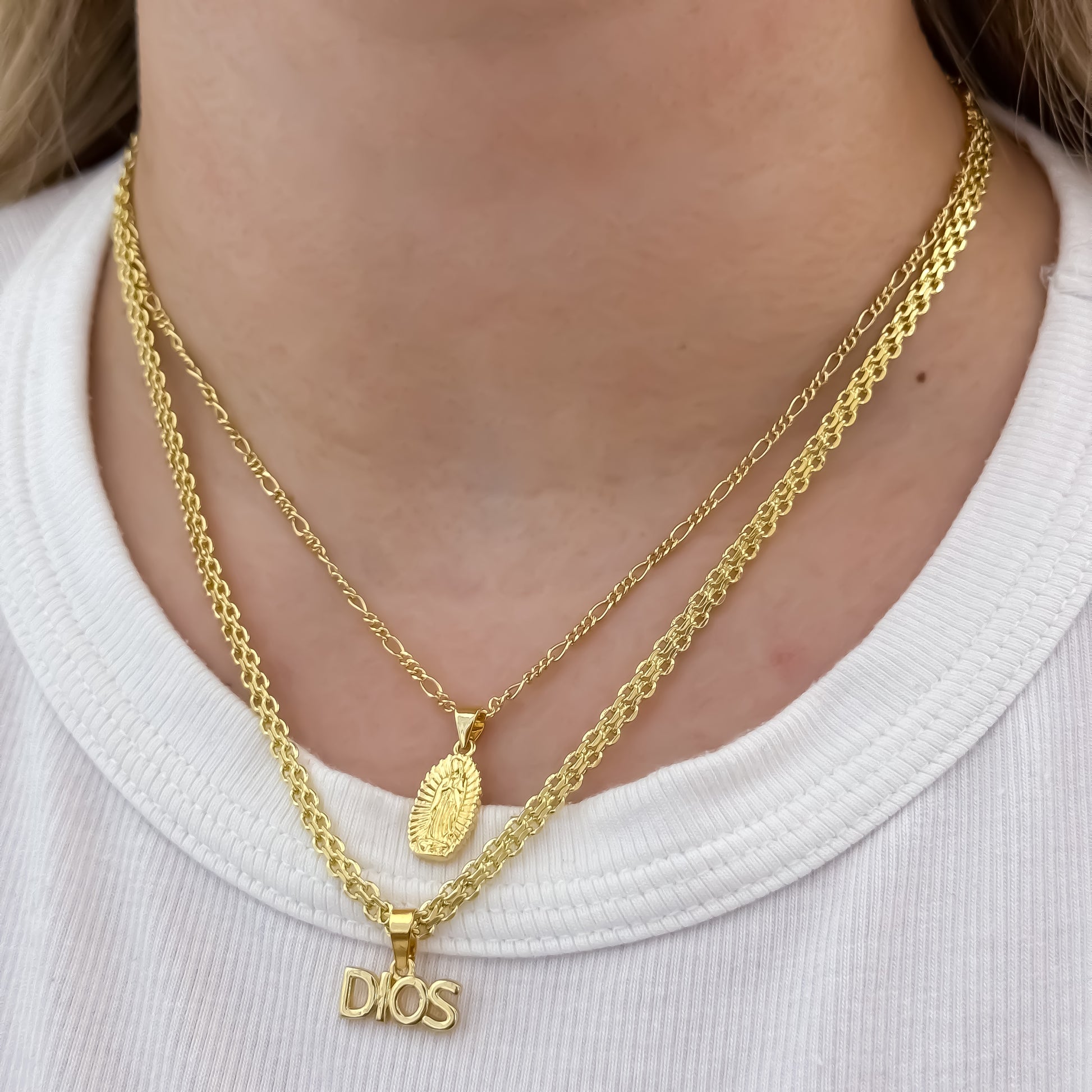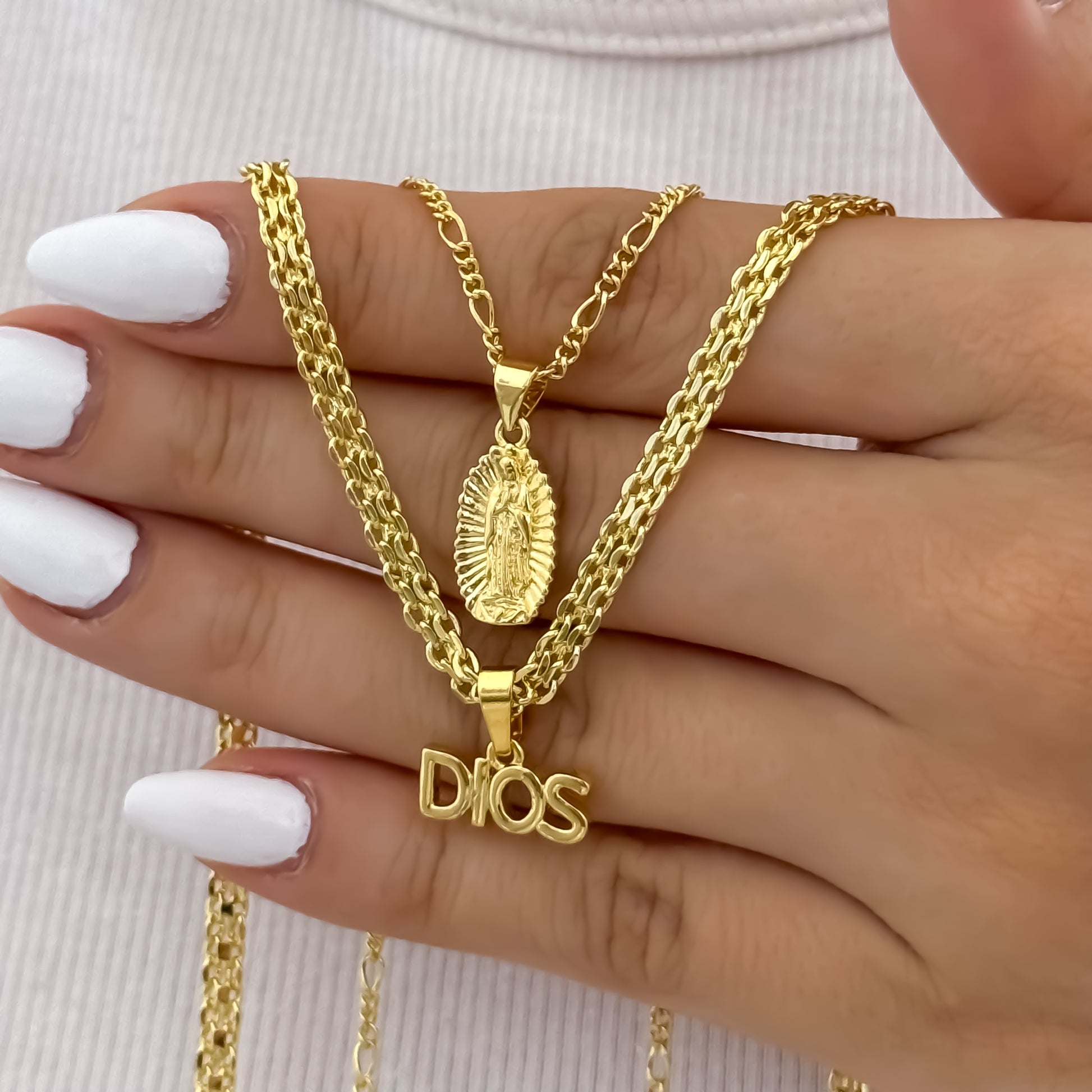 Cadena Tejido Chino de Dama de 45cm + Dije de Dios Proteccion + Cadena Catier de Dama de 40cm + Virgen de Guadalupe Tallada en Oro Laminado 18k con Garantia de por vida