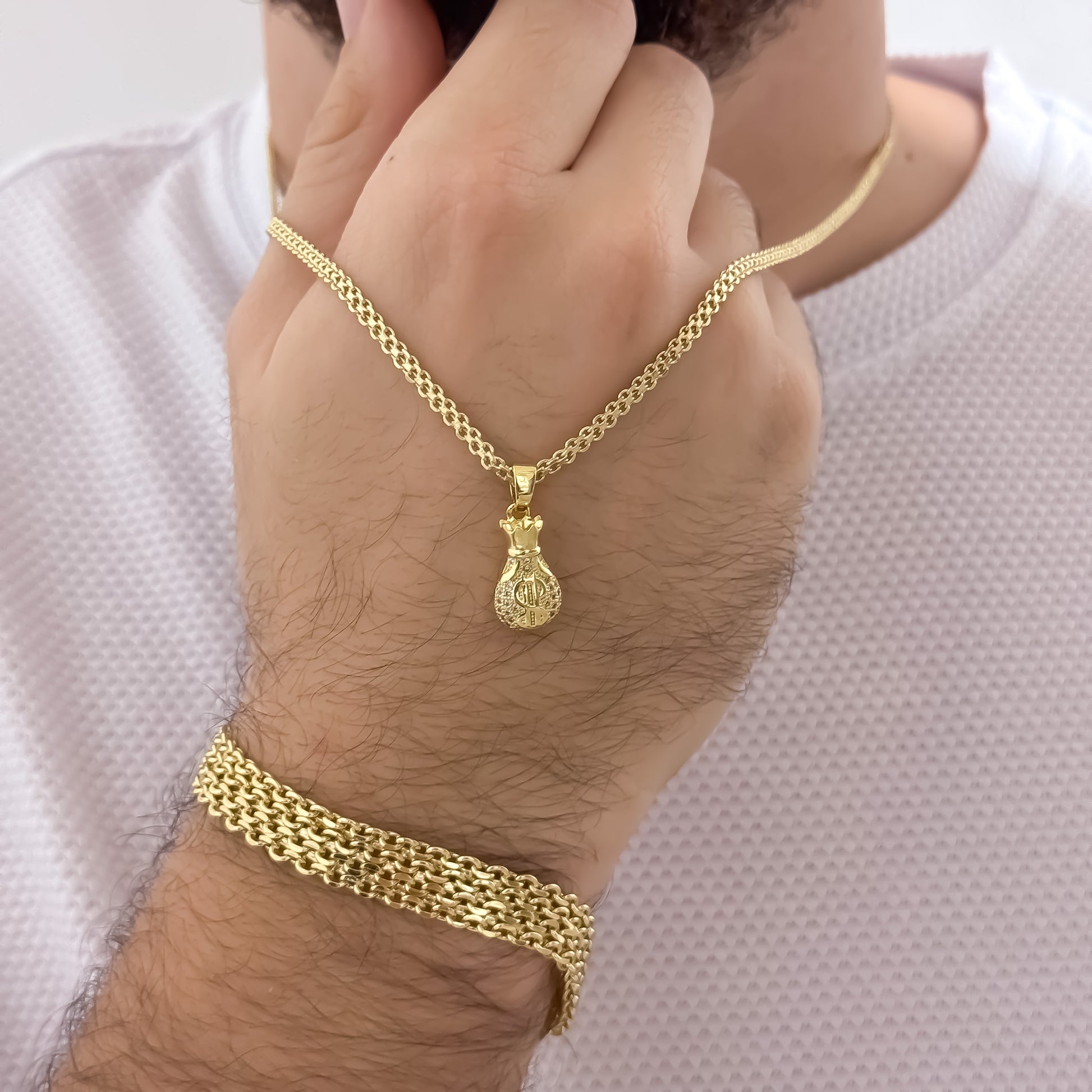 Cadena Tejido Chino de Hombre 60cm de 3mm + Dije de Bolsa de Dinero con micro circones + Pulsera Chino Gruesa de 10mm en Oro Laminado 18k con Garantia de por vida