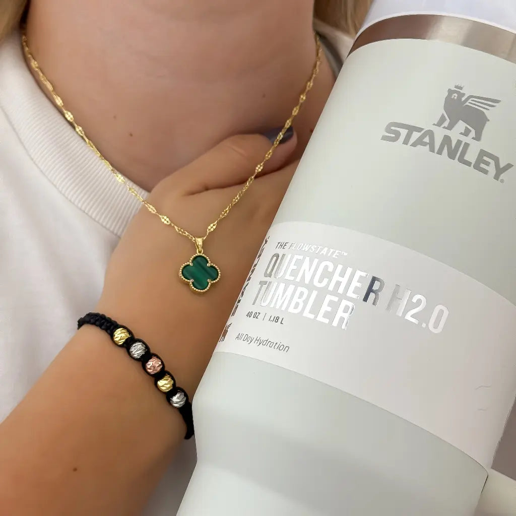 Cadena Tejido Crispeta 45cm + Trebol Verde de la buena Suerte + Pulsera Balin 4mm Balin Italiano de 3 Oros en Oro Laminado 18k con Garantia + Obsequio Termo Stanley