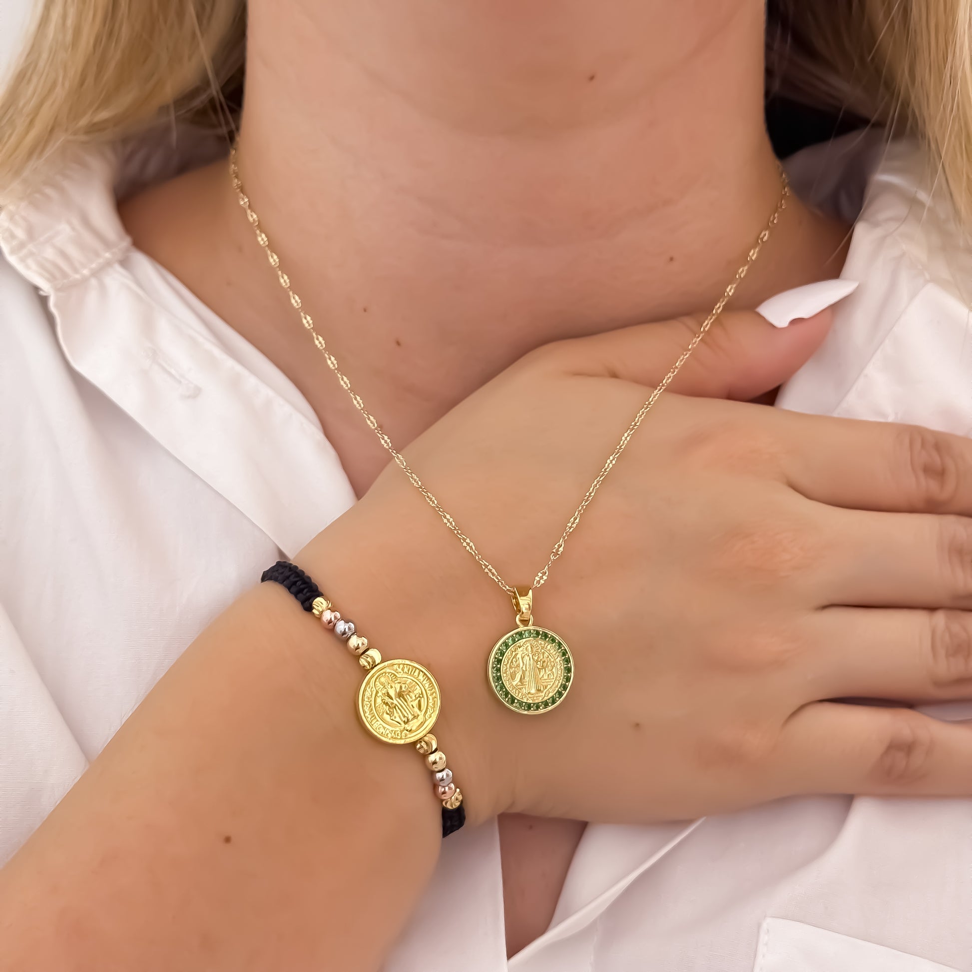 ✔ Dije de San Benito con micro circones verdes esmeralda – Belleza y protección en un solo diseño. ✔ Pulsera de 3 oros con dije de San Benito – Ajustable, elegante y cargada de energía positiva. Con este conjunto, no solo te verás increíble, sino que también llevarás contigo un poderoso amuleto de protección.