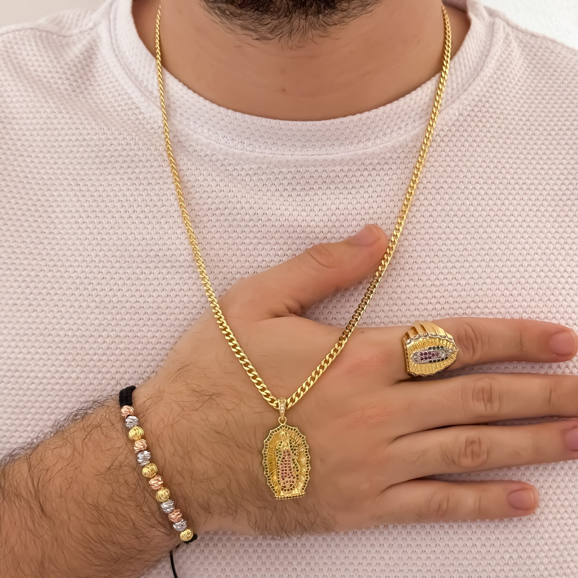 Cadena Tejido Cubana Hombre 60cm de 3mm + Virgen de Guadalupe talla Micro Circones + Anillo Virgen de Guadalupe + Pulseras de 3 Oros Balin italiano de 6mm en Oro Laminado 18k con Garantia de por vida