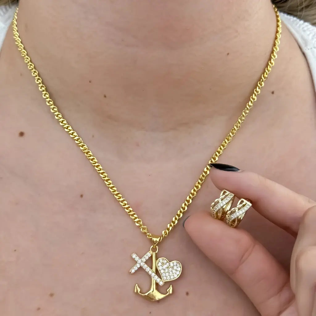 Cadena Tejido Escalera Plana de 45cm de 3mm de Grosor + Dije de las 3 Gracias + Candongas Trensada en oro Laminado 18k com Garantia de por vida