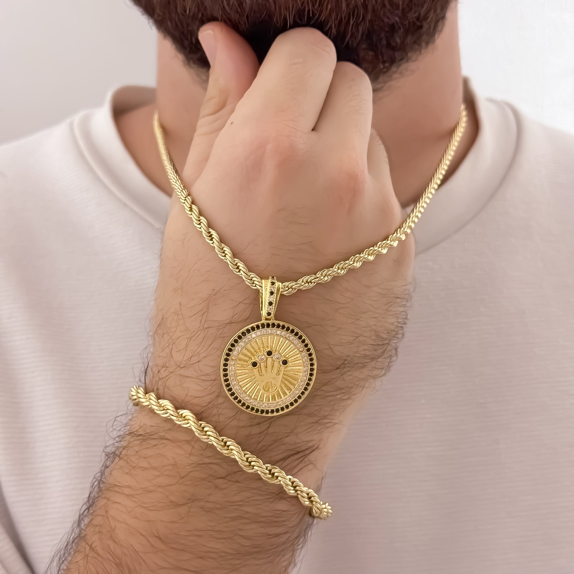 El dije de corona estilo Rolex con micro circones es, sin duda, la pieza que aporta el toque de distinción y sofisticación de tu conjunto. Fíjate en sus detalles: Forma y proporciones Perfil circular de aproximadamente 3 cm de diámetro, con bordes limpios y ligeramente biselados.
