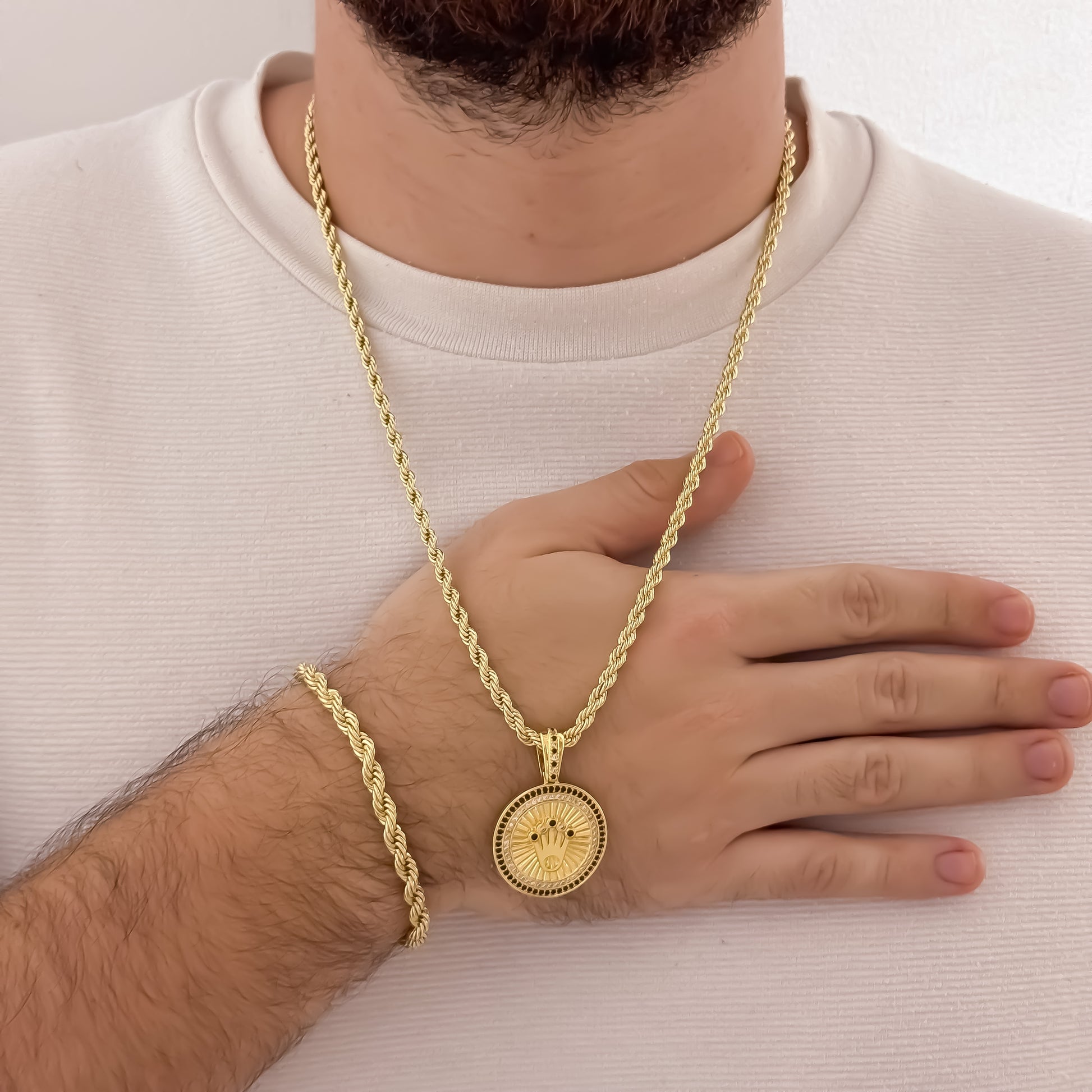 Cadena lazo gruesa 60 cm x 5 mm con corona estilo Rolex incrustada de micro circones negros y cristales: elegante y audaz, perfecta para llevar sola o con colgantes. Pulsera a juego 20 cm x 5 mm: el complemento ideal para un look coordinado, moderno y poderoso. Brillo y color idénticos al oro puro: nadie sabrá que no es oro macizo, pero tu bolsillo lo agradecerá.