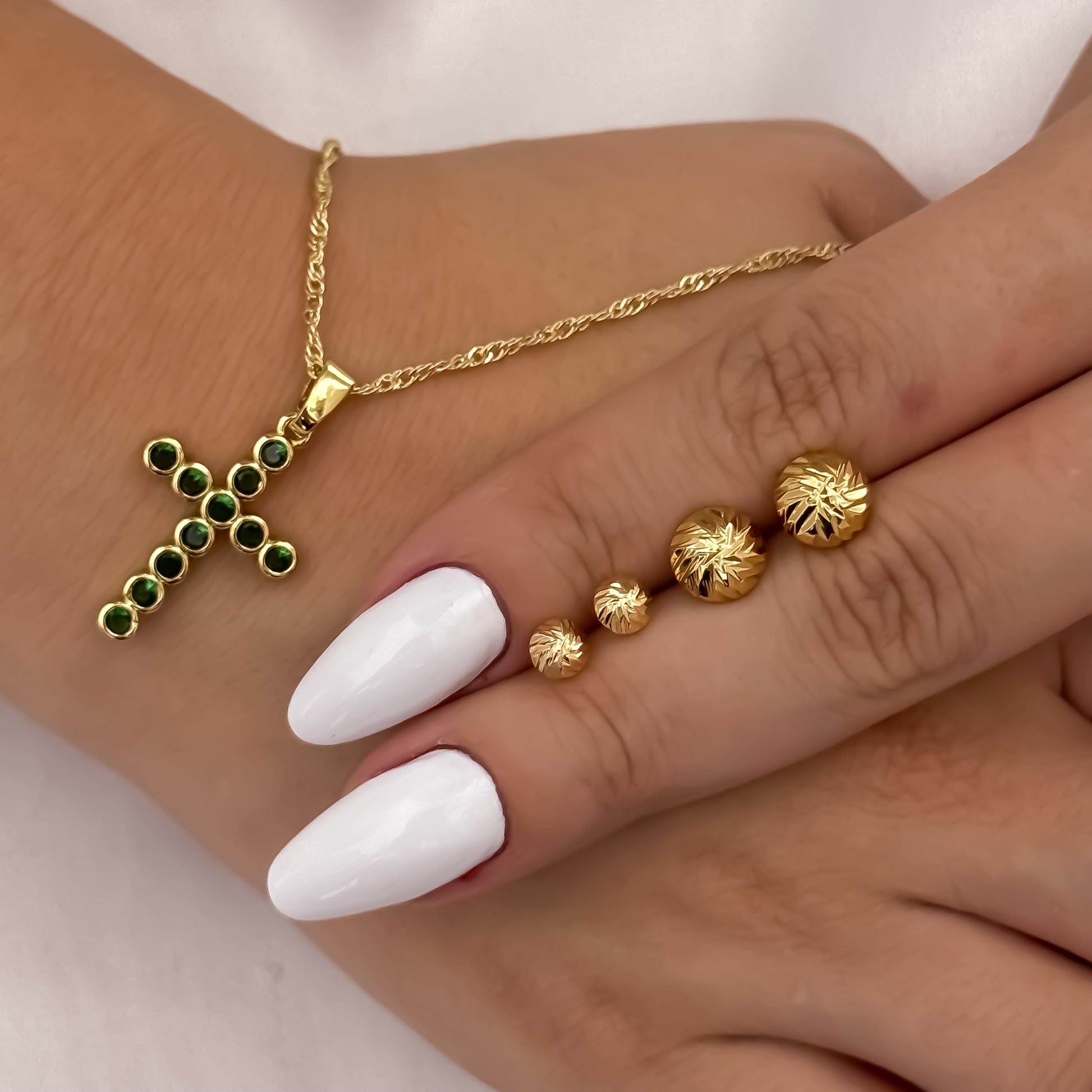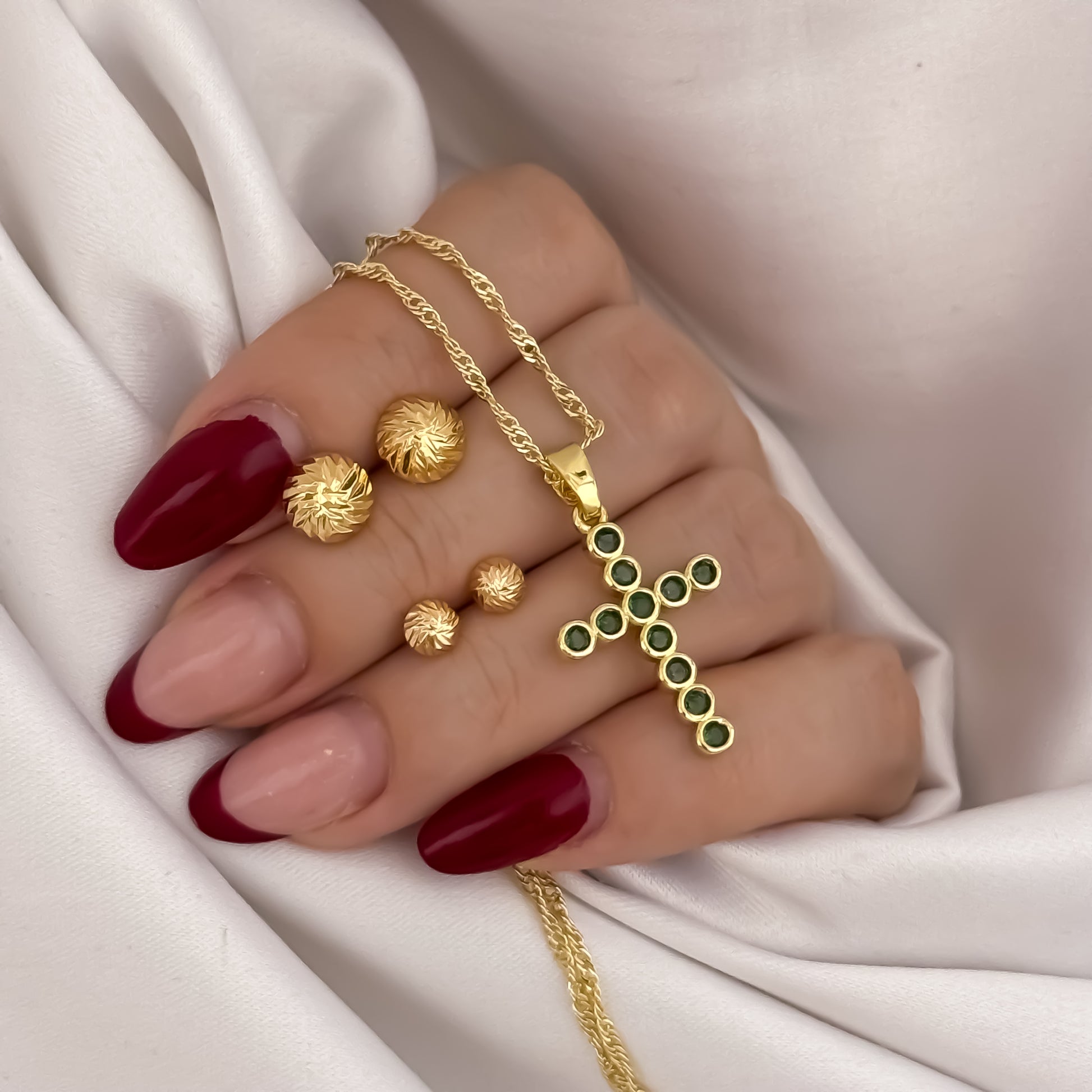 La cadena Singapur de 45cm aporta delicadeza, el dije de cruz con esmeraldas verdes refleja luz y protección, y los aretes diamantados en balín de 8mm y 6mm hacen que tus orejas brillen con una elegancia inigualable.