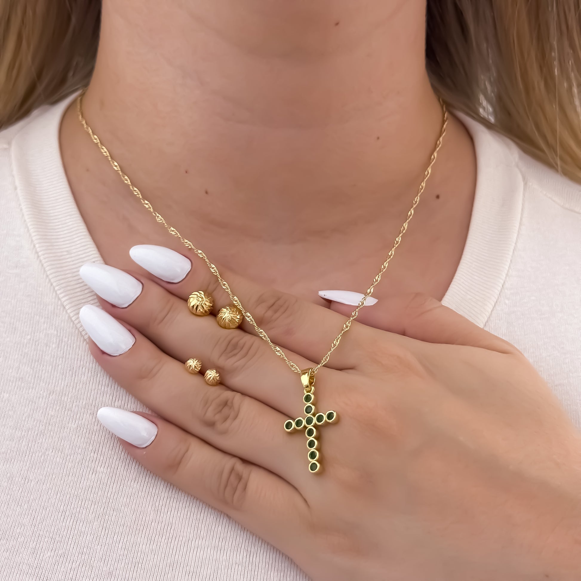 La cadena Singapur de 45cm es ligera y elegante. El dije de cruz con esmeraldas verdes te da un brillo sofisticado y un toque de fe. Los aretes diamantados (8mm y 6mm) realzan tus orejas con un destello increíble.