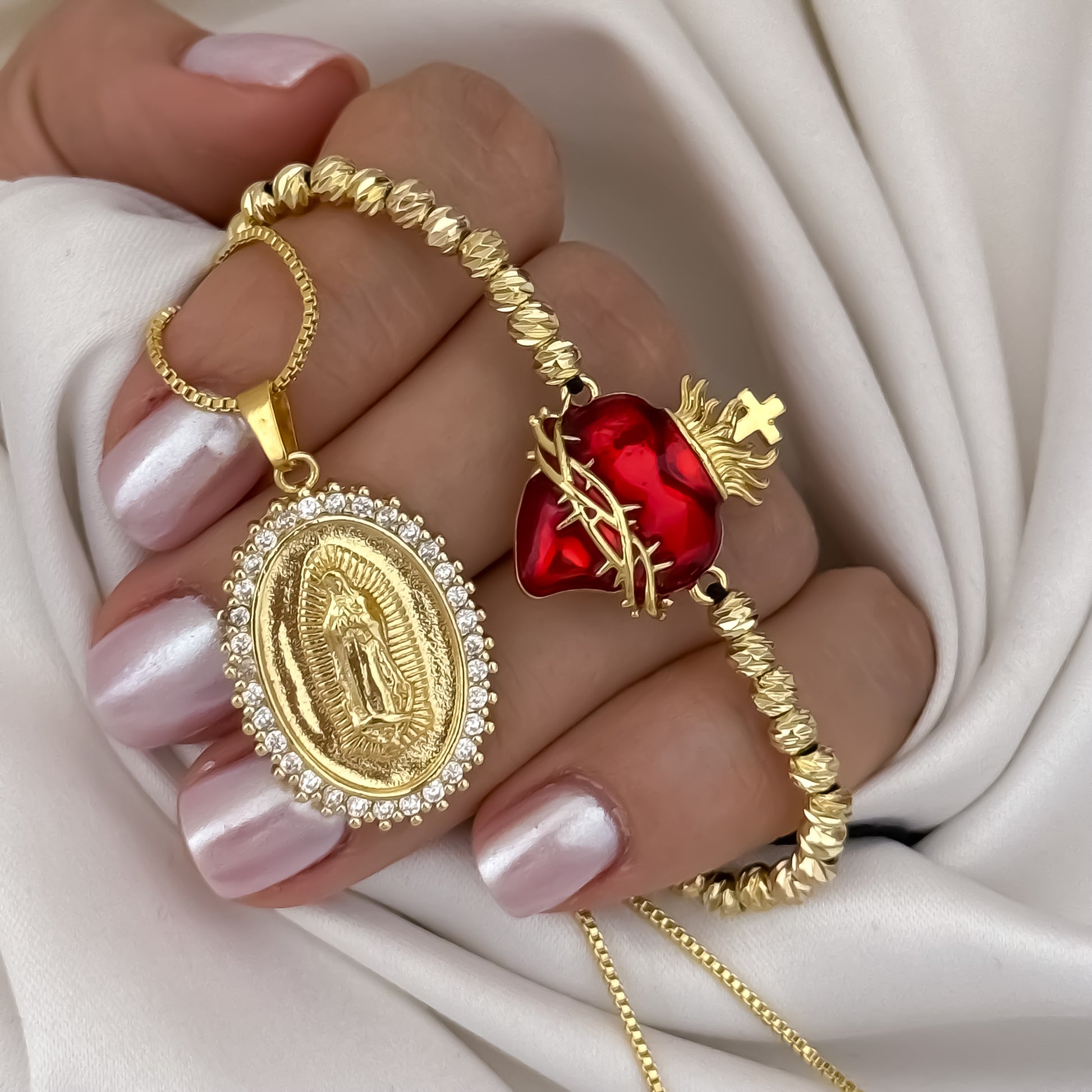 Complementando este conjunto se encuentra una pulsera balín italiana con un hermoso dije del Sagrado Corazón de Jesús, también en oro laminado de 18K. Su diseño clásico y su elaboración artesanal hacen de esta pieza un símbolo de fe y protección. Llevar el Corazón de Jesús en la muñeca es llevar un mensaje de amor infinito, perdón y consuelo divino, como el abrazo eterno de una madre.