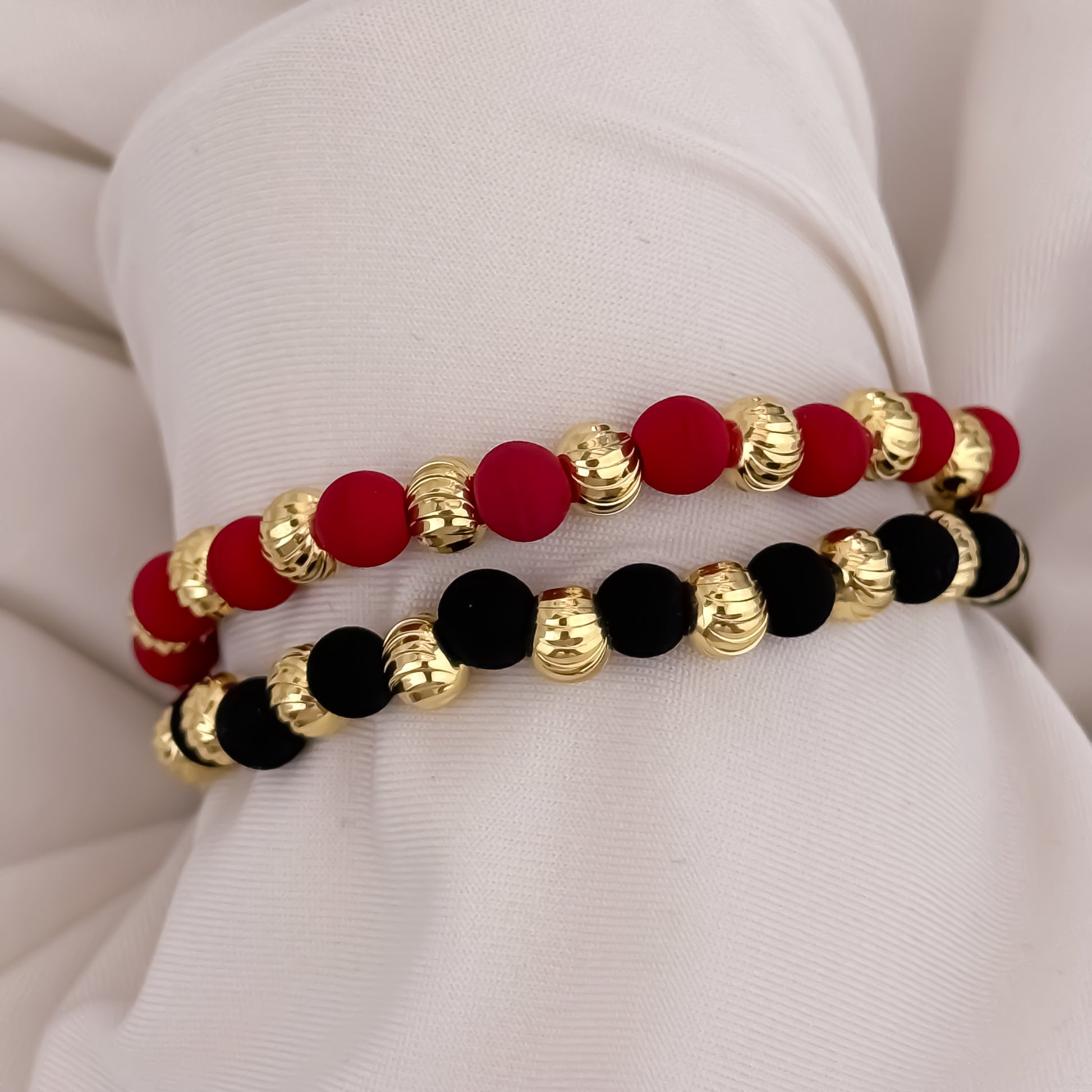 Descubre nuestras exclusivas pulseras de pareja, diseñadas para quienes desean llevar siempre consigo un recordatorio especial de su amor y conexión. Estas pulseras combinan la elegancia de los balines italianos de 4 mm en oro laminado de 18 quilates con la calidez y significado de los hilos rojos entrelazados, que representan la suerte, el amor y la unión inquebrantable.